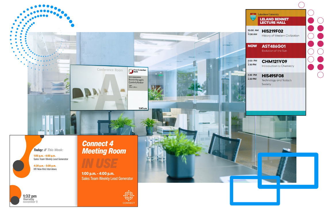 Screens outside of meeting rooms are a convenient and efficient way to ensure attendees find where they need to go. Use dynamic templates with event titles, start times, and organizers' names to capture attention quickly. Integrate meeting room screens with calendars and other systems to ensure they update in real time and reflect changes or cancellations.