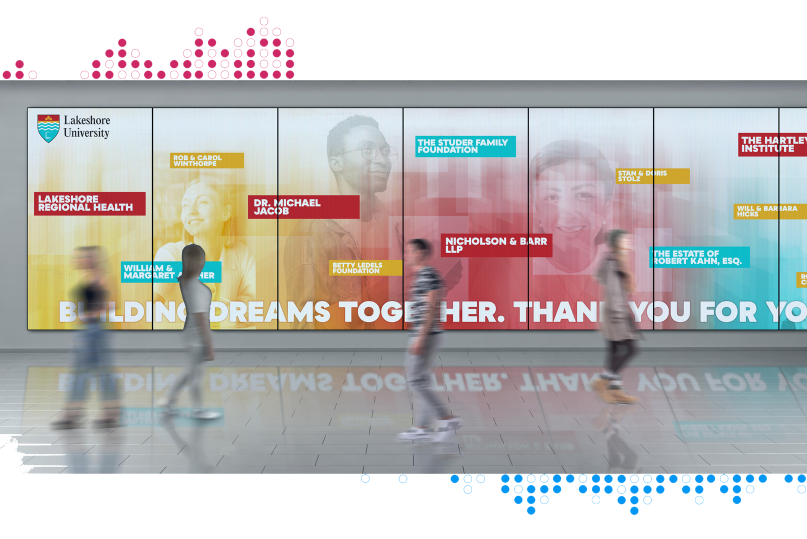 Use your digital donor wall to run a real-time fundraising campaign. Highlight progress towards your goal and integrate your fundraising platform to show a live list of donors. Incorporate 4K video and graphics to grab attention and highlight the results of donations - new facilities, equipment, scholarship recipients, and more.