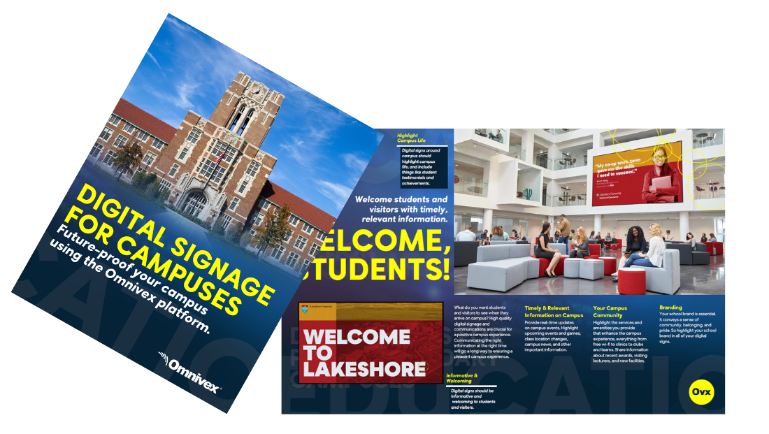 College and university campuses are typically large, multi-building affairs. Whether a student, staff, or visitor, a positive and stress-free experience is essential. Effective visual communications go a long way in ensuring a positive campus environment. Omnivex digital signage software can help manage every aspect of your campus communications. Provide students, staff, and visitors with clear wayfinding, real-time scheduling, news and events, health & safety info, and more on screens across your campus.