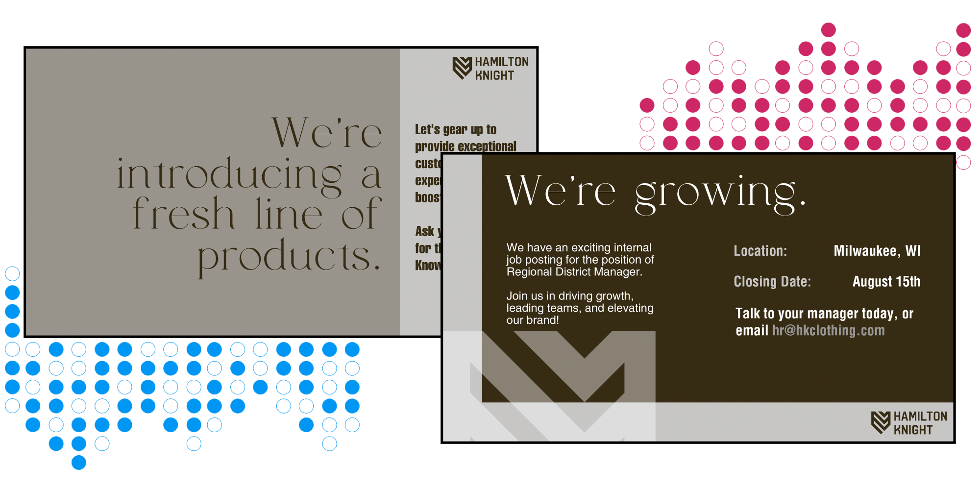 Keep staff updated with inventory, sales, special promotions, new product and service offerings, and more on digital screens in employee areas. Put information at their fingertips - literally - with a mobile app. Additionally, use digital signage to highlight recent achievements, such as employee top sales or loss prevention stats. Lastly, include customer accolades or other praise from the brands' social media networks on digital screens.
