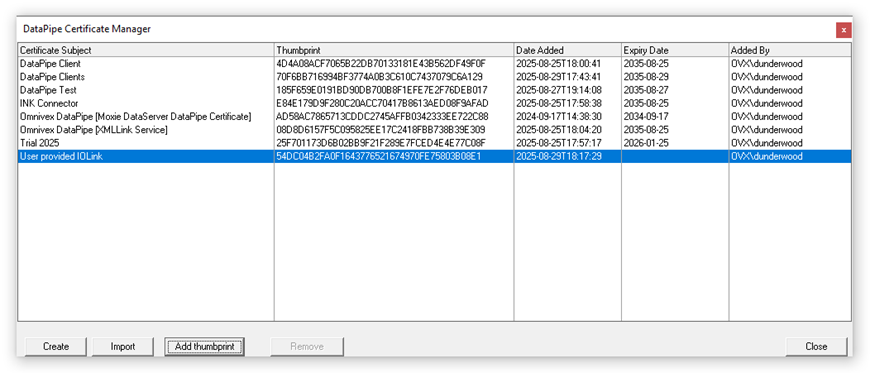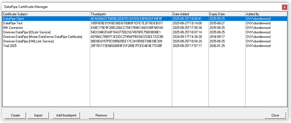 Copy this thumbprint and forward to the administrator of the DataPipe 7 Server. Now enter this information into the “Add Thumbprint” dialog box along with a temporary name.