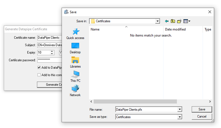[x] Add to this computer’s certificate store? Will automatically install this certificate on the PC you are generating the certificate. This can be useful for testing DataPipe client apps locally on this machine.