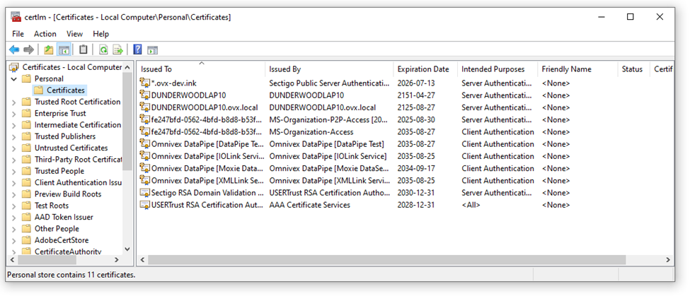 Here is a list of certificates on the remote PC under Personal\Certificates. One of the certificates installed on this PC was generated in the past for IOLink.