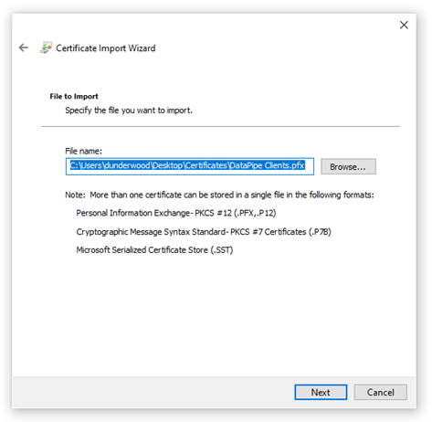 Copy your new certificate onto the PC that you wish to install an Omnivex DataPipe client application.