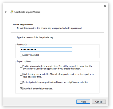 This is the Password provided by the Certificate creator who generated the certificate. You can leave all the check boxes in their default state. Click <Next>