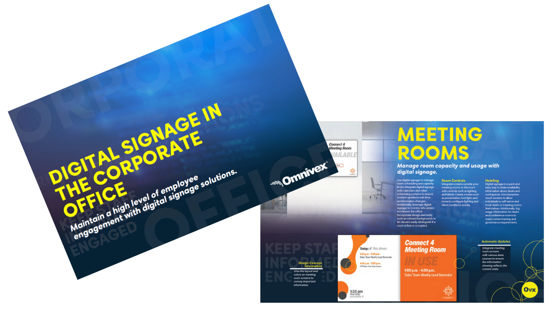 Enhance employee and visitor experience with digital signage screens created using Omnivex software. From welcome screens to meeting room screens to behind-the-scenes monitoring and operations screens, there's no limit to what you can create to help manage every aspect of your organization. Locate digital signs everywhere, including the factory floor, break room, boardroom, lobby, and anything in between. Effective visual communications go a long way in ensuring a positive environment, engaging employees, and improving productivity.
