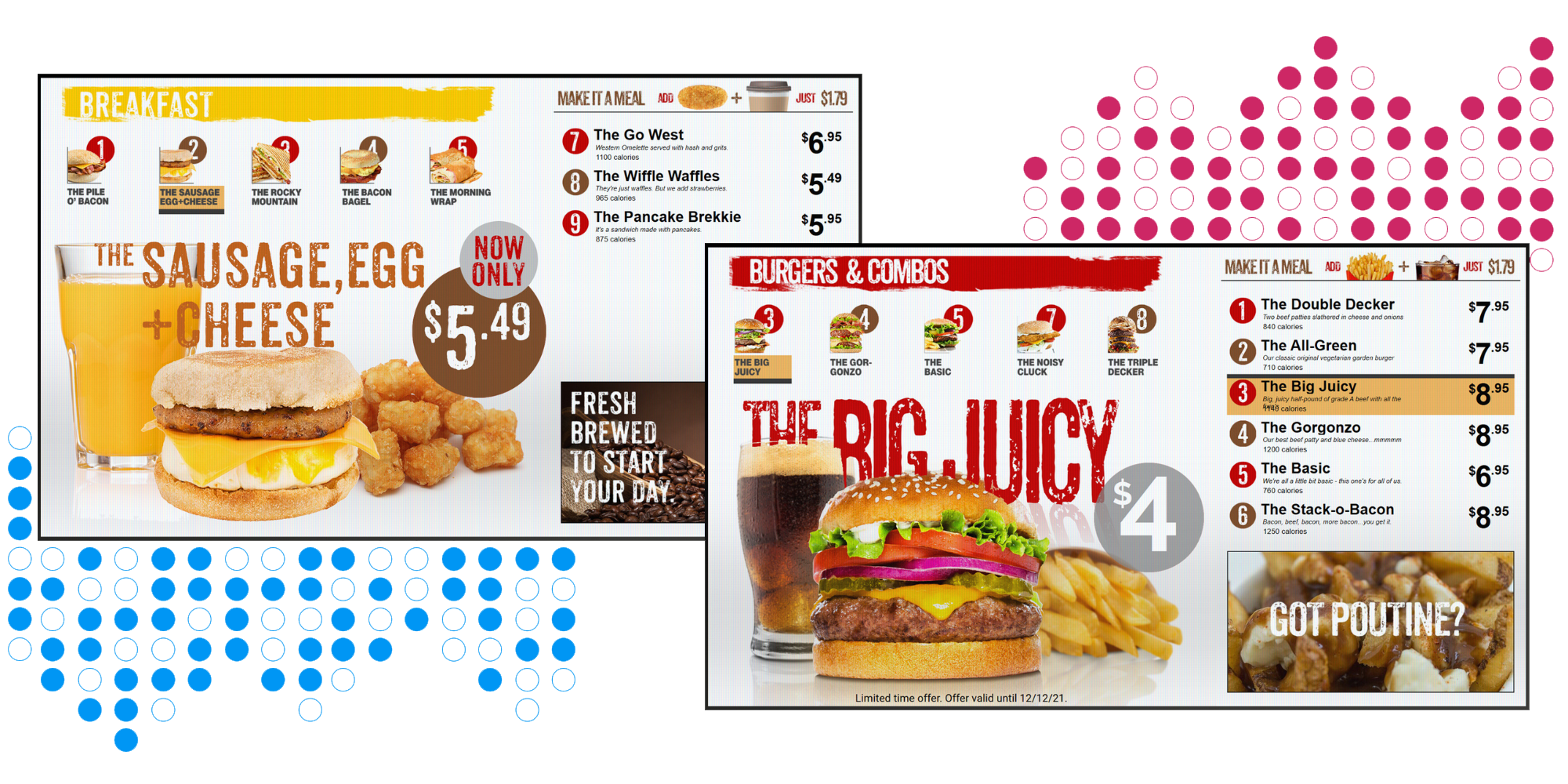 Highlight menu items, nutritional information, promotions, and pricing on drive-thru screens. Automate the changing of content to reflect various conditions, such time of day.