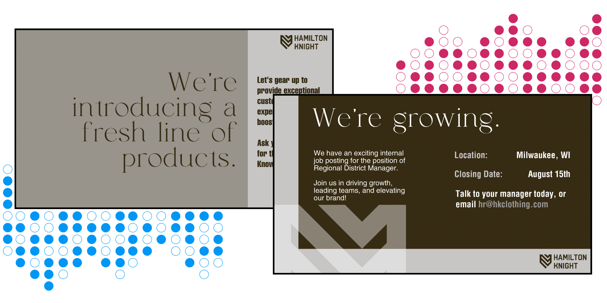 Keep staff updated with inventory, sales, special promotions, new product and service offerings, and more on digital screens in employee areas. Put information at their fingertips - literally - with a mobile app. Additionally, use digital signage to highlight recent achievements, such as employee top sales or loss prevention stats. Lastly, include customer accolades or other praise from the brands' social media networks on digital screens.