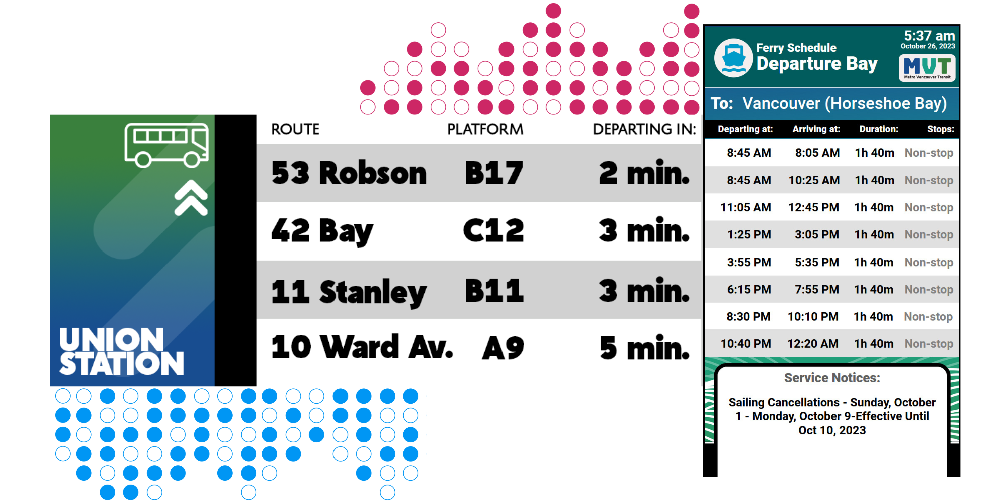 Design your screens with clear text and high-contrast colors. Share wait time, delays, route construction or maintenance updates, emergency notifications, and more. Additionally, provide details on screens such as current date, time, weather conditions, and local events to enhance the passenger experience.