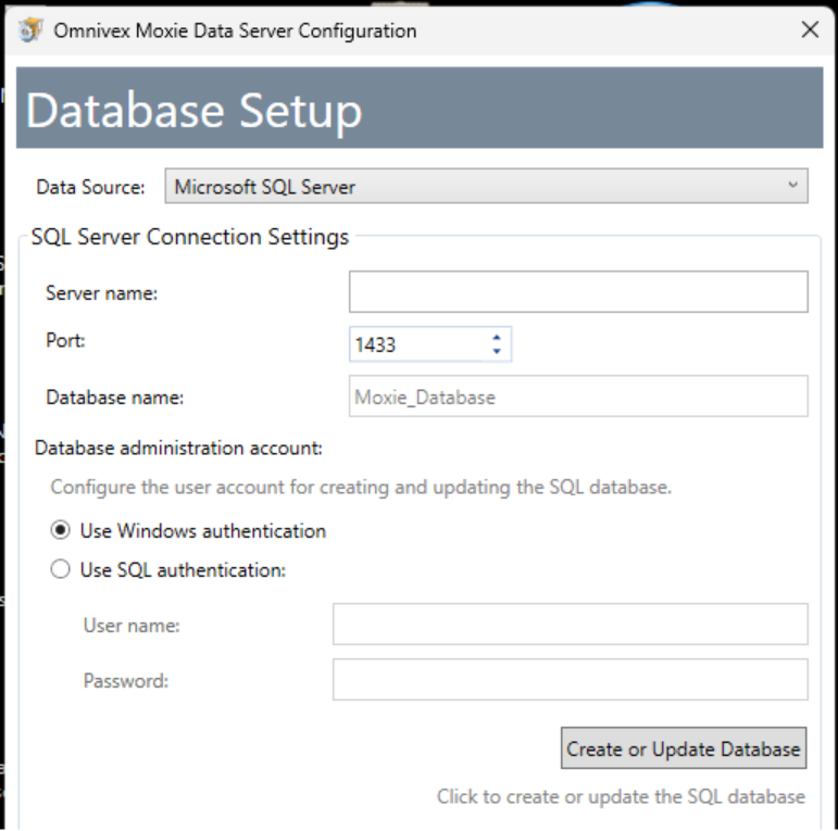 Point Moxie to the new SQL Server by removing the old SQL Server name and replace it with the new SQL Server name and press the Create or Update Database button to confirm that Moxie is able to access the new SQL Server.