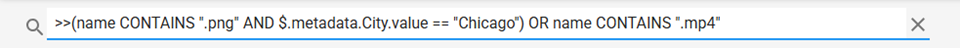 OR | Logical OR | >>name CONTAINS ".png" OR name CONTAINS ".mp4" |